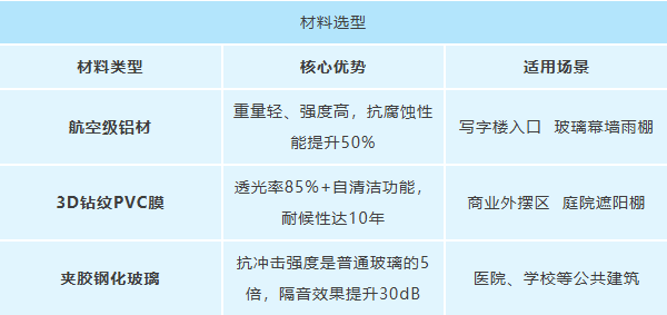 在玻璃雨棚表面植入薄膜太陽能板,年發(fā)電量可達(dá)500度/㎡,適配綠色建筑認(rèn)證需求;