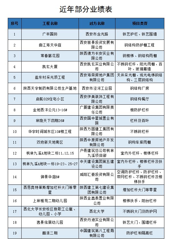 公司自創(chuàng)建以來,一直不斷完善產(chǎn)品體系,以******的管理團(tuán)隊推行量化管理和目標(biāo)技術(shù)管理,達(dá)到企業(yè)高度和諧持續(xù)發(fā)展的經(jīng)營理念,遵循“誠信做人,踏實做事”的經(jīng)營思路,本著“技術(shù)創(chuàng)新為源,質(zhì)量誠信為本”的經(jīng)營策略,恪守誠信、踏實、敬業(yè)、拼搏的態(tài)度,高效、專業(yè)、系統(tǒng)、科學(xué)化的管理。目前,業(yè)績覆蓋政府公立項目、大型商業(yè)圈、住宅等的輕、重型鋼結(jié)構(gòu)施工、樓宇及室內(nèi)外鋼結(jié)構(gòu)、幕墻、市政及地鐵圍擋、圍墻、門頭玻璃雨棚、車庫玻璃雨棚、臨建標(biāo)準(zhǔn)化防護(hù)、不銹鋼欄桿及大門、鐵藝欄桿及大門、各類型材及新型材料的欄桿、百葉、塑鋼門窗、不銹鋼、鋁合金、電梯門套及包邊裝飾工程、各類型材的地彈門等工程項目。