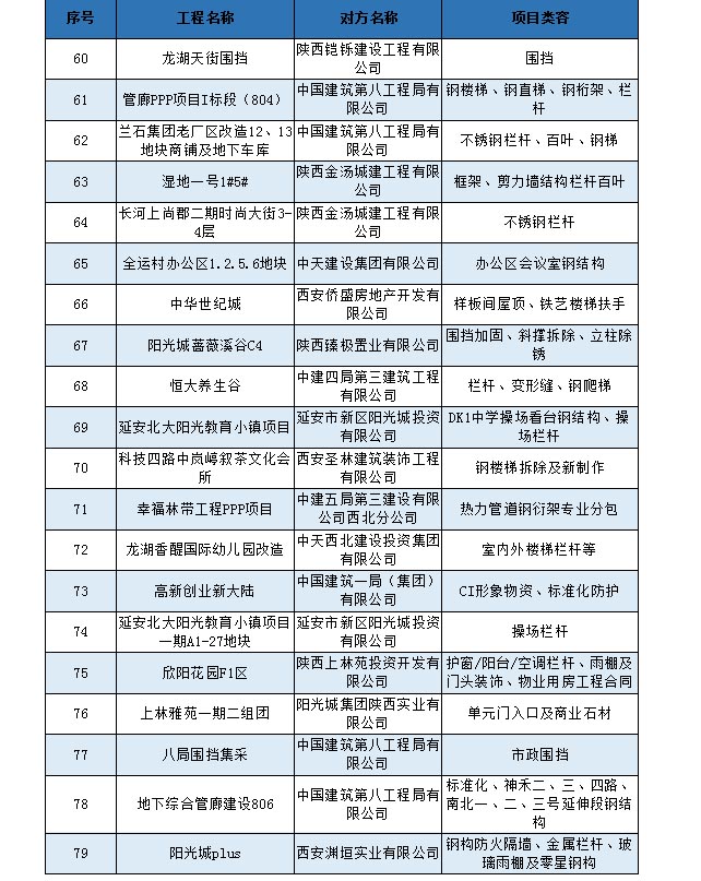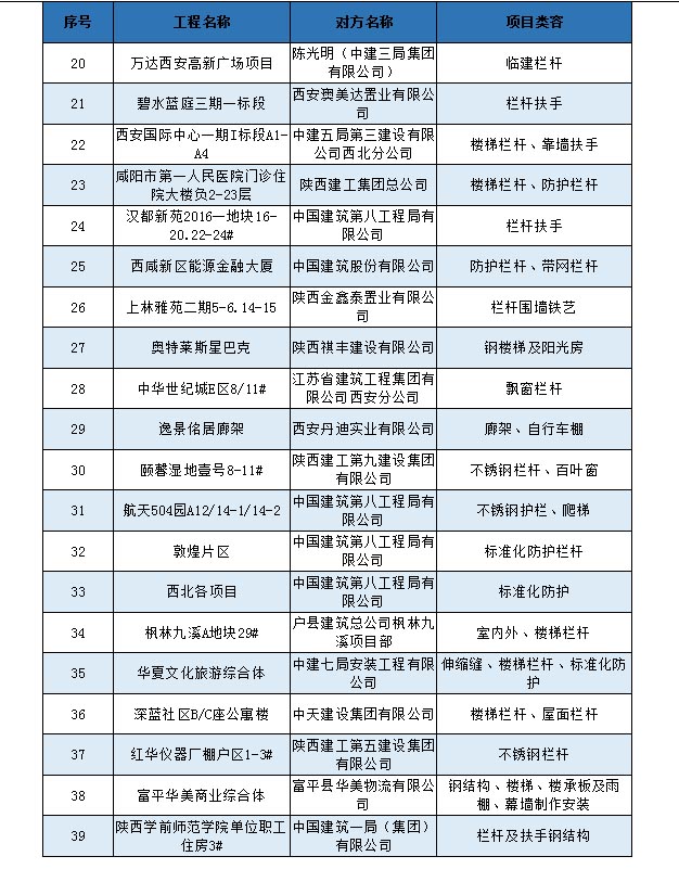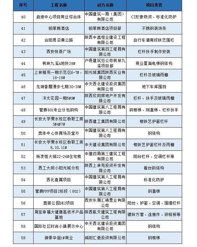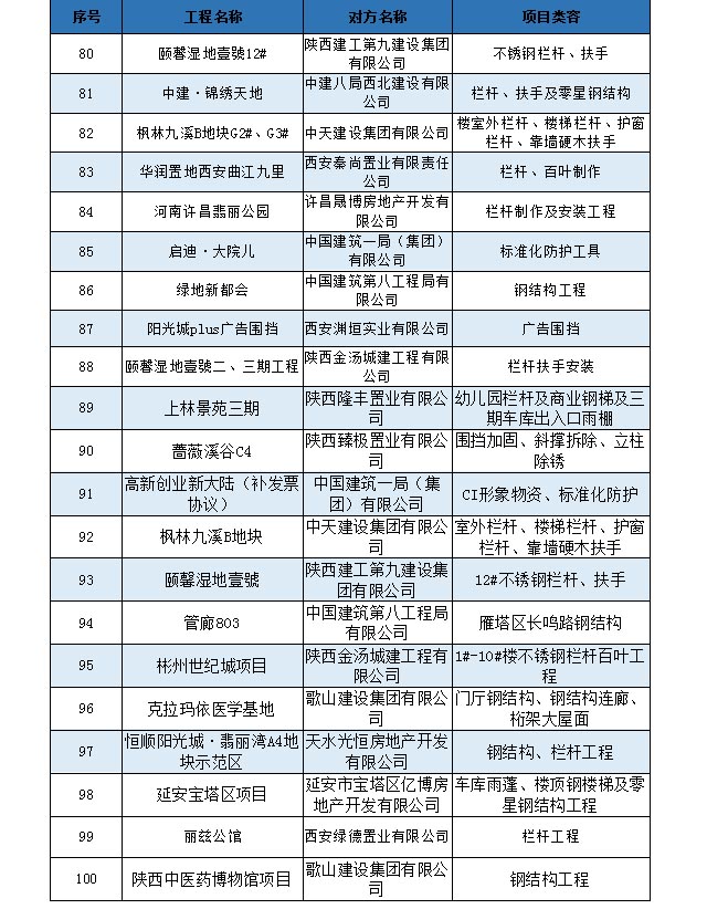 多年來,我公司與陽光城地產(chǎn)、華潤地產(chǎn)、龍湖地產(chǎn)、中國建筑一到八局、陜建各建設(shè)公司及分公司、中天建設(shè)集團(tuán)、歌山建設(shè)集團(tuán)、新城控股集團(tuán)、中海地產(chǎn)、天地源地產(chǎn)、碧桂園地產(chǎn)等集團(tuán)公司均建立了良好的合作關(guān)系,共同為全人類的建筑事業(yè)而努力奮斗!