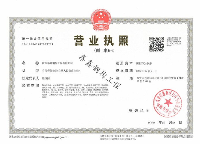陜西泰鑫鋼構工程有限公司成立于2006年7月,注冊資金3000萬,2016年泰鑫集團成立,下設陜西科農食品有限公司、陜西領協實業(yè)有限公司及陜西金農科供應鏈管理有限公司,鮑衛(wèi)國先生為公司法人兼董事長。公司現擁有標準化生產基地,欄桿、百葉、幕墻和鋼結構綜合性生產車間三萬余平,噴塑生產車間萬余平,是一家專業(yè)生產、加工、批發(fā)、銷售、服務為一體的建筑鋼構制品設計施工企業(yè)。公司具備工程專業(yè)多項承包貳級資質,業(yè)績覆蓋政府公立項目、大型商業(yè)圈、住宅等的輕、重型鋼結構施工、樓宇及室內外鋼結構、幕墻、市政及地鐵圍擋、圍墻、門頭玻璃雨棚、車庫玻璃雨棚、臨建標準化防護、不銹鋼欄桿及大門、鐵藝欄桿及大門、各類型材及新型材料的欄桿、百葉、塑鋼門窗、不銹鋼、鋁合金、電梯門套及包邊裝飾工程、各類型材的地彈門等工程項目。