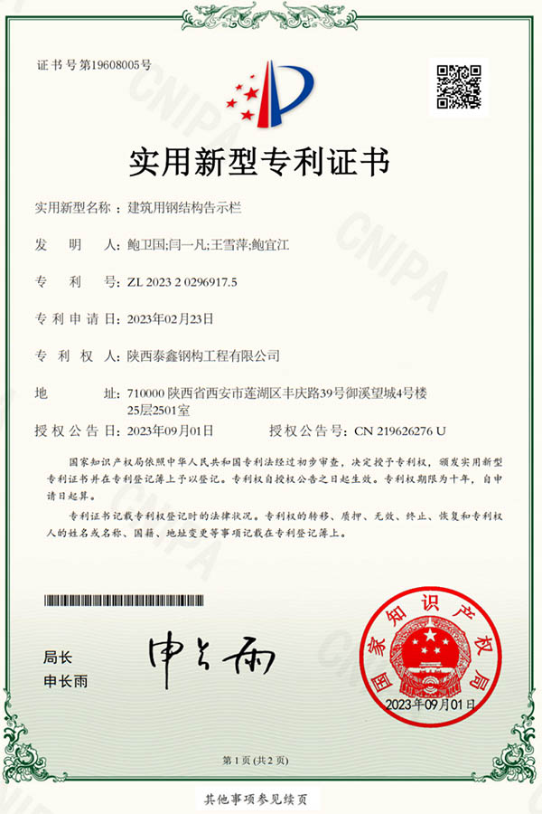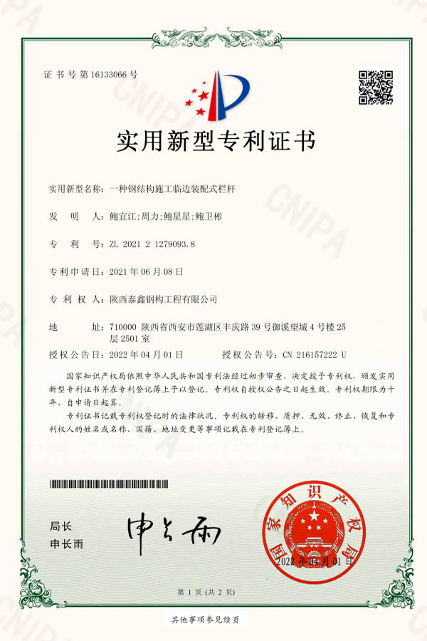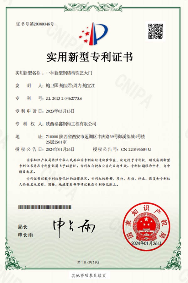 陜西泰鑫鋼構工程有限公司成立于2006年7月,注冊資金3000萬,公司現(xiàn)擁有標準化生產(chǎn)基地,欄桿、百葉、幕墻和鋼結構綜合性生產(chǎn)車間三萬余平,噴塑生產(chǎn)車間萬余平,是一家專業(yè)生產(chǎn)、加工、批發(fā)、銷售、服務為一體的建筑鋼構制品設計施工企業(yè)。公司具備工程專業(yè)多項承包貳級資質,業(yè)績覆蓋政府公立項目、大型商業(yè)圈、住宅等的輕、重型鋼結構施工、樓宇及室內外鋼結構、幕墻、市政及地鐵圍擋、圍墻、門頭玻璃雨棚、車庫玻璃雨棚、臨建標準化防護、不銹鋼欄桿及大門、鐵藝欄桿及大門、各類型材及新型材料的欄桿、百葉、塑鋼門窗、不銹鋼、鋁合金、電梯門套及包邊裝飾工程、各類型材的地彈門等工程項目。